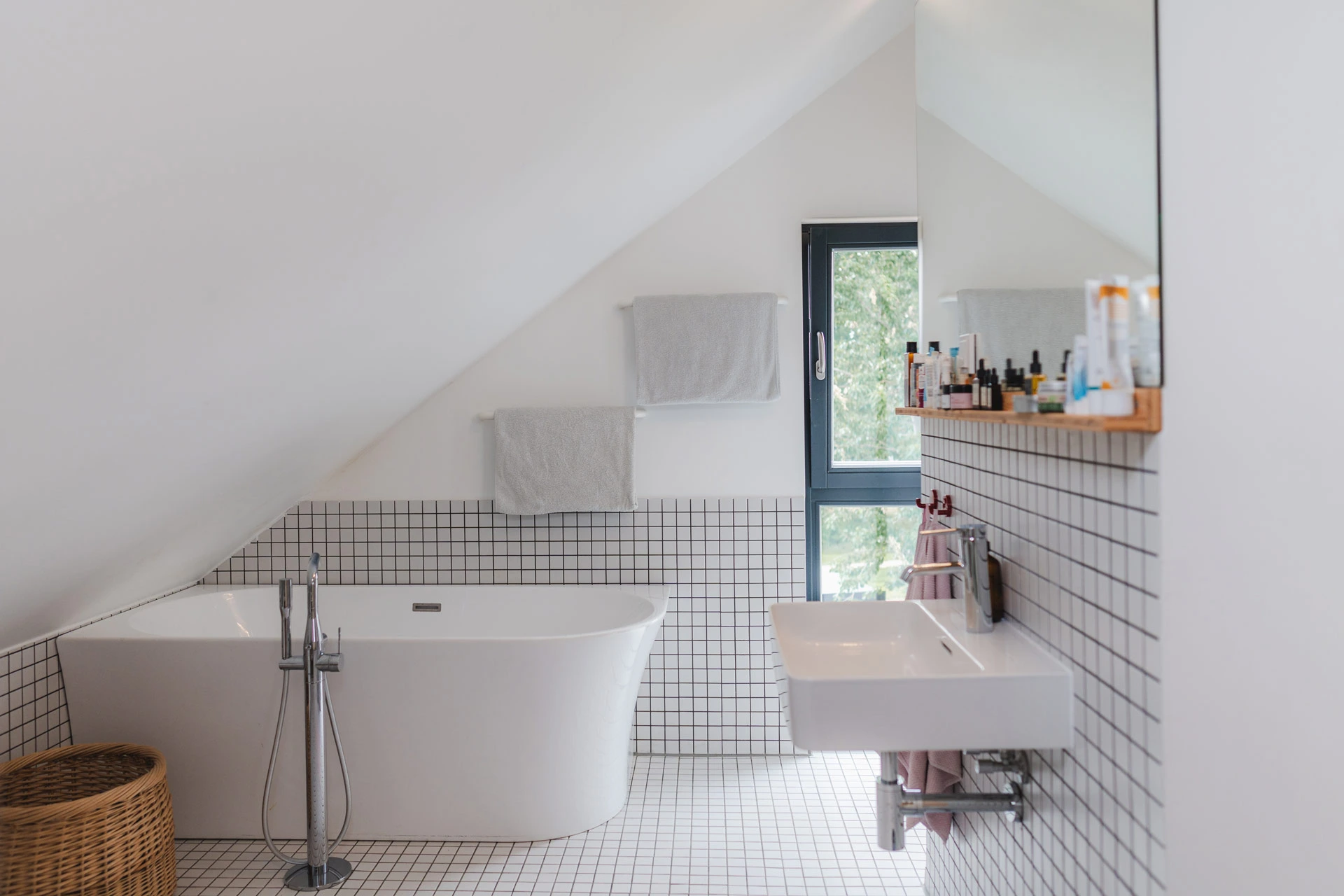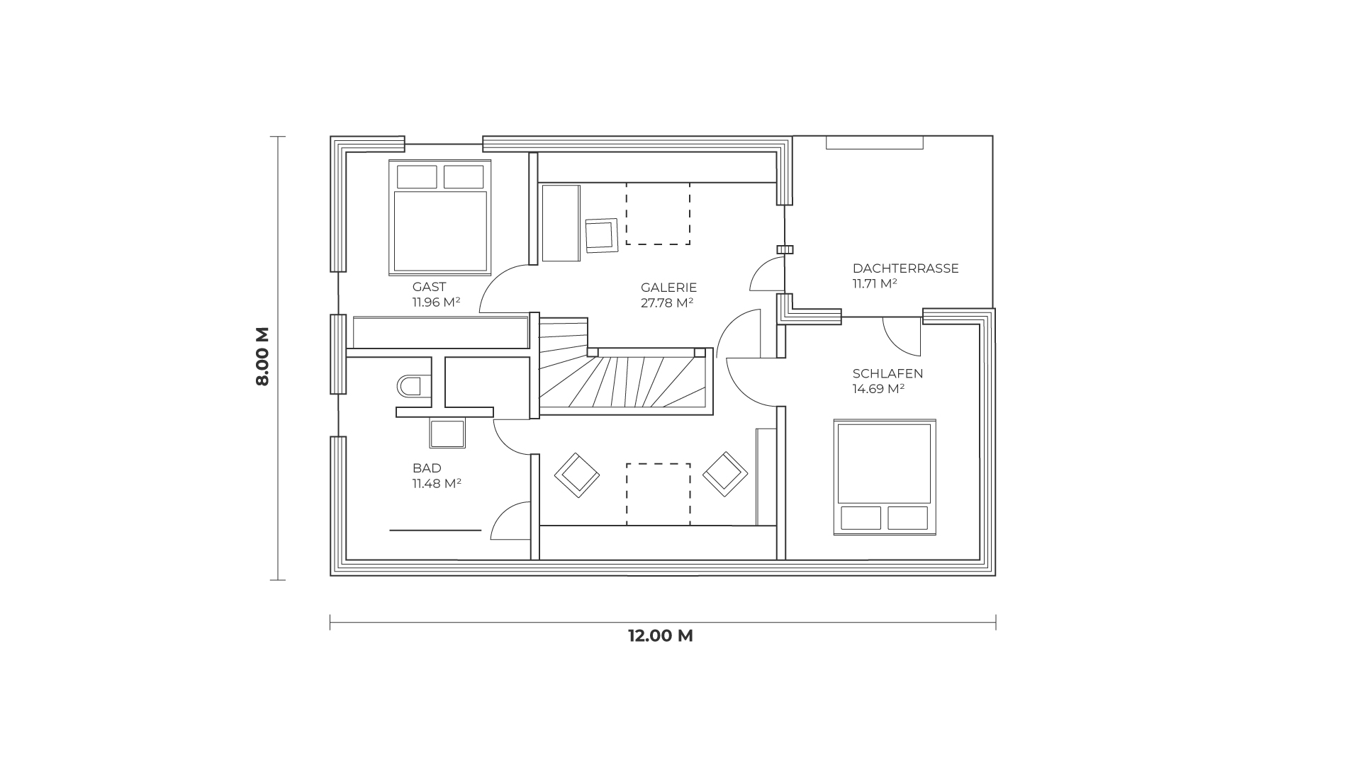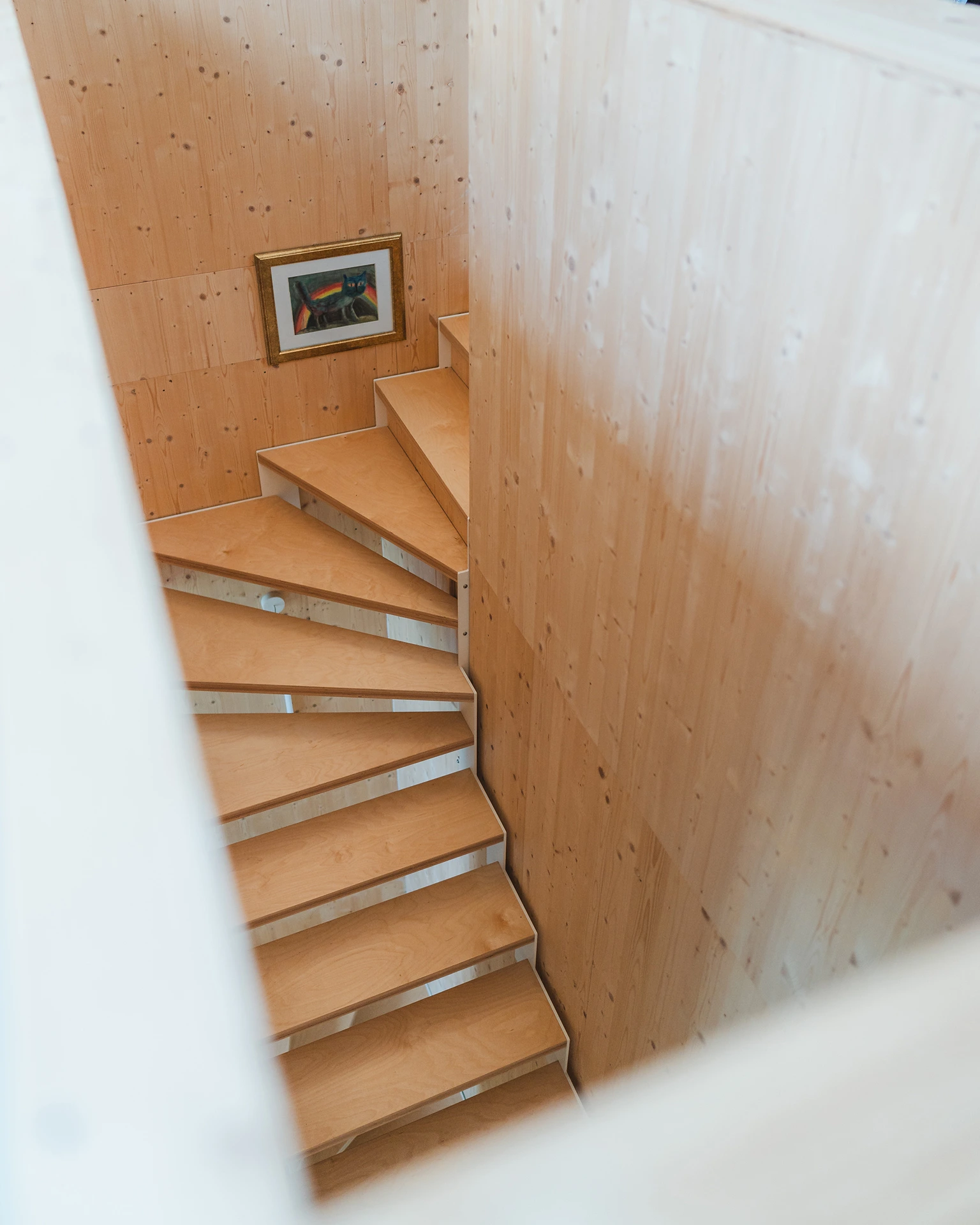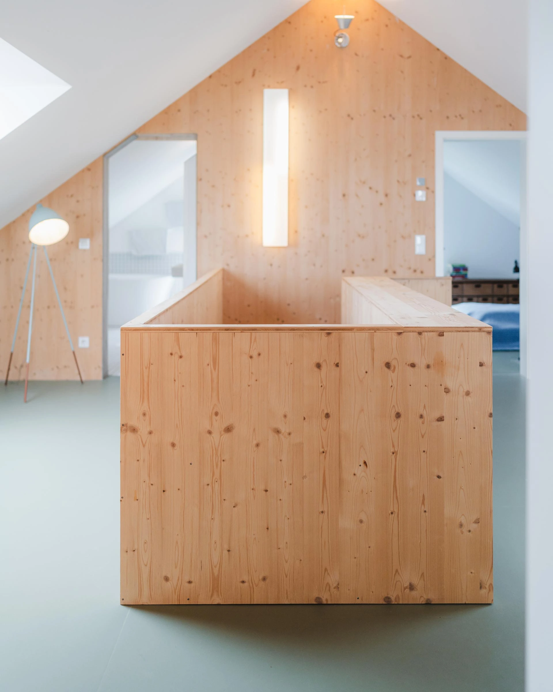 In diesem MAX Haus nimmt die Anzahl der Besonderheiten kein Ende. Angefangen bei einer Holzfassade aus sibirischer Lärche, die über drei Etagen geht. Sie vergraut über die Zeit und bildet eine natürlich silberfarbene Patina. Auch bei den Innenräumen wurde möglichst viel Sichtholz eingesetzt. Wände und Decken wurden aus CLT, also Brettsperrholz hergestellt und naturbelassen. Dadurch wirken der offene Wohnbereich und die Schlafzimmer besonders gemütlich und ein spürbar angenehmes Raumklima entsteht. Weiter geht es mit einem separaten Bereich, der Arbeitsräume von Wohnräumen trennt. Er ist sowohl durch das Wohnzimmer als auch durch eine separate Hauseingangstür erreichbar. Ein spezielles Extra ist die Kletterwand an den CLT-Wänden. Darauf folgt ein vollausgestattetes Treppenauge aus Sichtholz über alle drei Etagen. Und natürlich darf eine kleine Dachterrasse im dritten Stockwerk nicht fehlen. Hier kann man ungestört die Sonne genießen und den Trubel des Alltags hinter sich lassen.