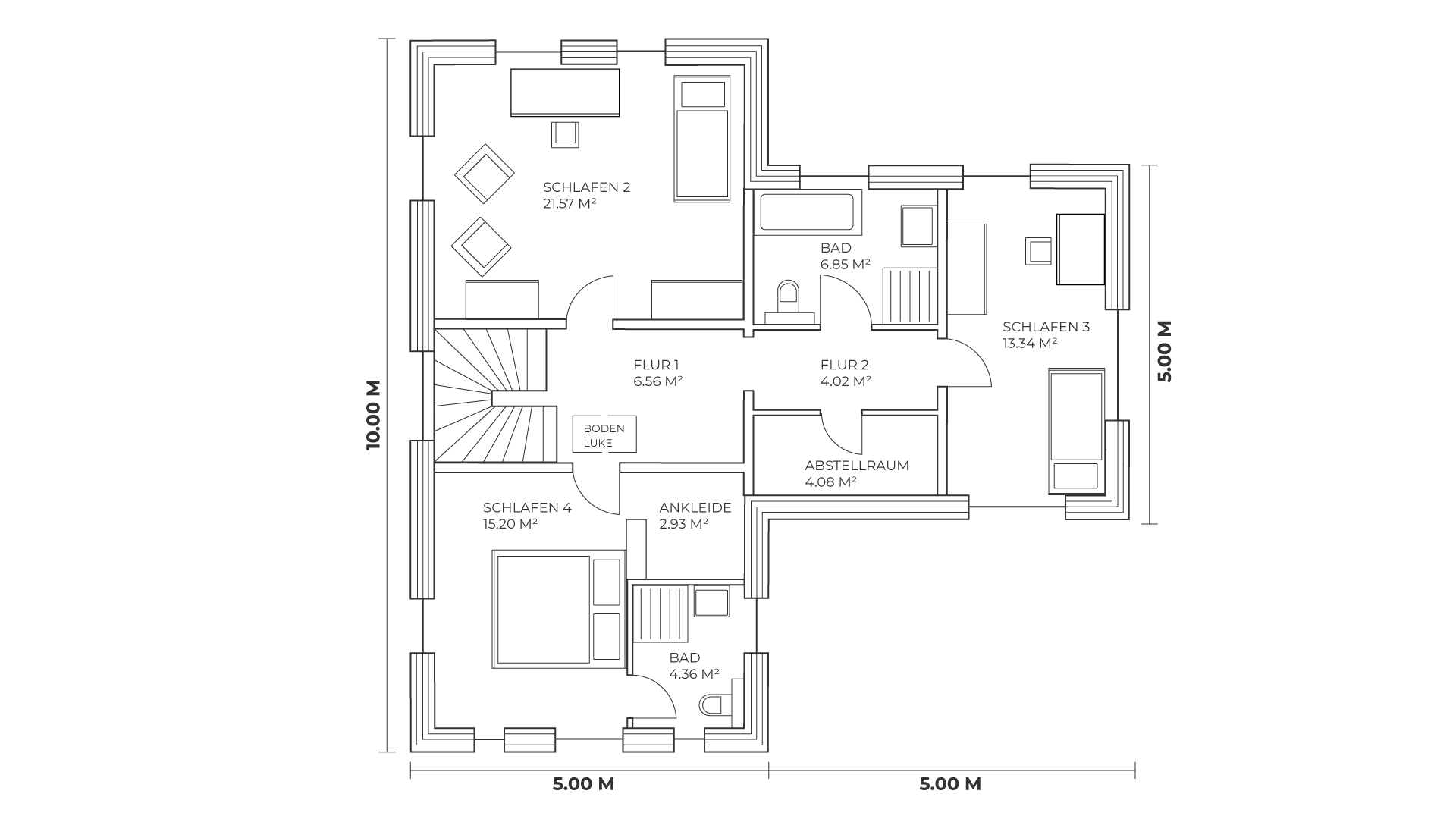 Im Hausinneren setzt sich die warme und natürliche Atmosphäre fort: Hochwertiges Parkett verleiht den Räumen Eleganz und Wohnkomfort. Mit seiner gelungenen Kombination aus Funktionalität, Gemütlichkeit und charakterstarkem Design bietet dieses Schwedenhaus großzügigen Platz und eine einzigartige Wohnqualität für Familien.