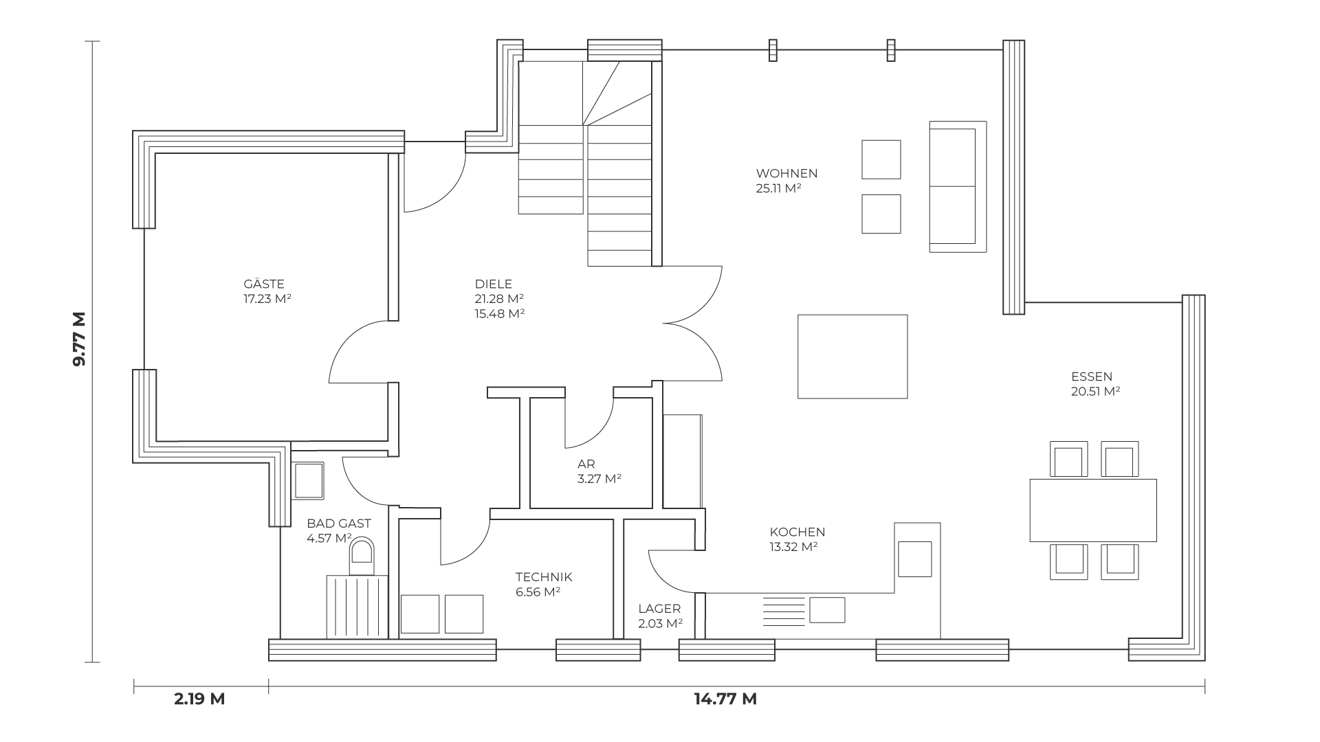 Eine Leichtigkeit, die den Besucher auch in den Innenräumen empfängt. Durchgängig viel Freiraum bieten Küche, Ess- und Wohnbereich: sie wurden als großzügige Einheit gestaltet, in deren Mittelpunkt der Kamin für Gemütlichkeit sorgt. Das gegenüber liegende Gästezimmer mit eigenem Bad ermöglicht Privatheit ebenso wie Familienanschluss. Sein Kubus aus warmem, dunklem Holz öffnet sich zur Natur und fungiert als Terrasse. Im Obergeschoss finden wir ein großes Elternschlafzimmer mit geräumiger Ankleide, das private Elternbad und drei Kinder- oder Gästezimmer mit separatem Duschbad.