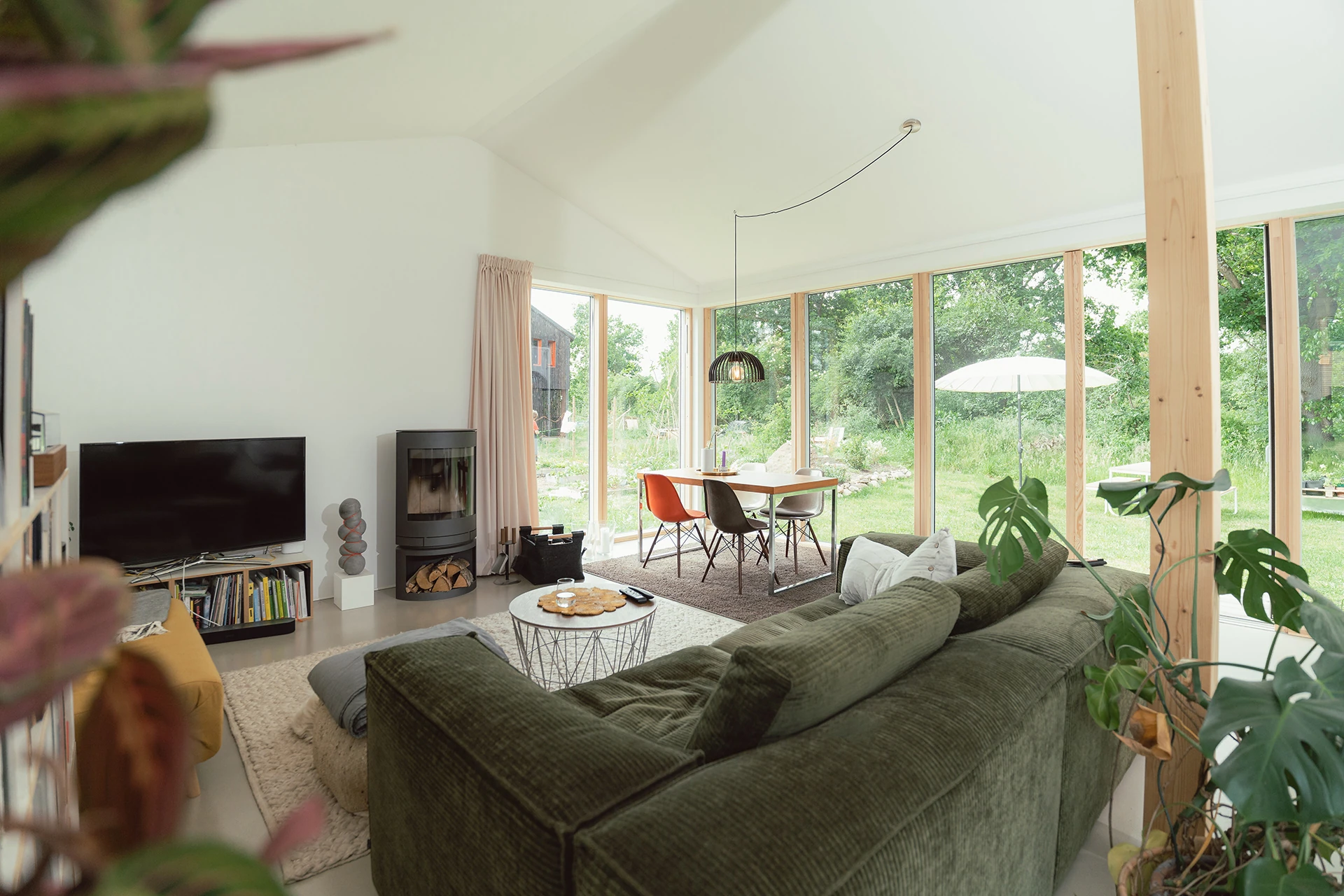 Aus der Stadt ins Grüne! Mit diesem Bungalow in moderner Holzbauweise haben sich unsere Bauherren den Traum vom altersgerechten Wohnen auf dem Land erfüllt. Der individuell geplante Architektenentwurf berücksichtigt alle Wünsche der Baufamilie und schafft auf 87 Quadratmetern ein harmonisches Zuhause. Der Fokus liegt auf einem offenen Wohn- und Küchenbereich, der dank des Blicks in den Garten zum Verweilen einlädt. Gleichzeitig bieten gemütliche Rückzugsorte Raum für Entspannung. Hier wurden alle Bedürfnisse durchdacht und optimal umgesetzt.