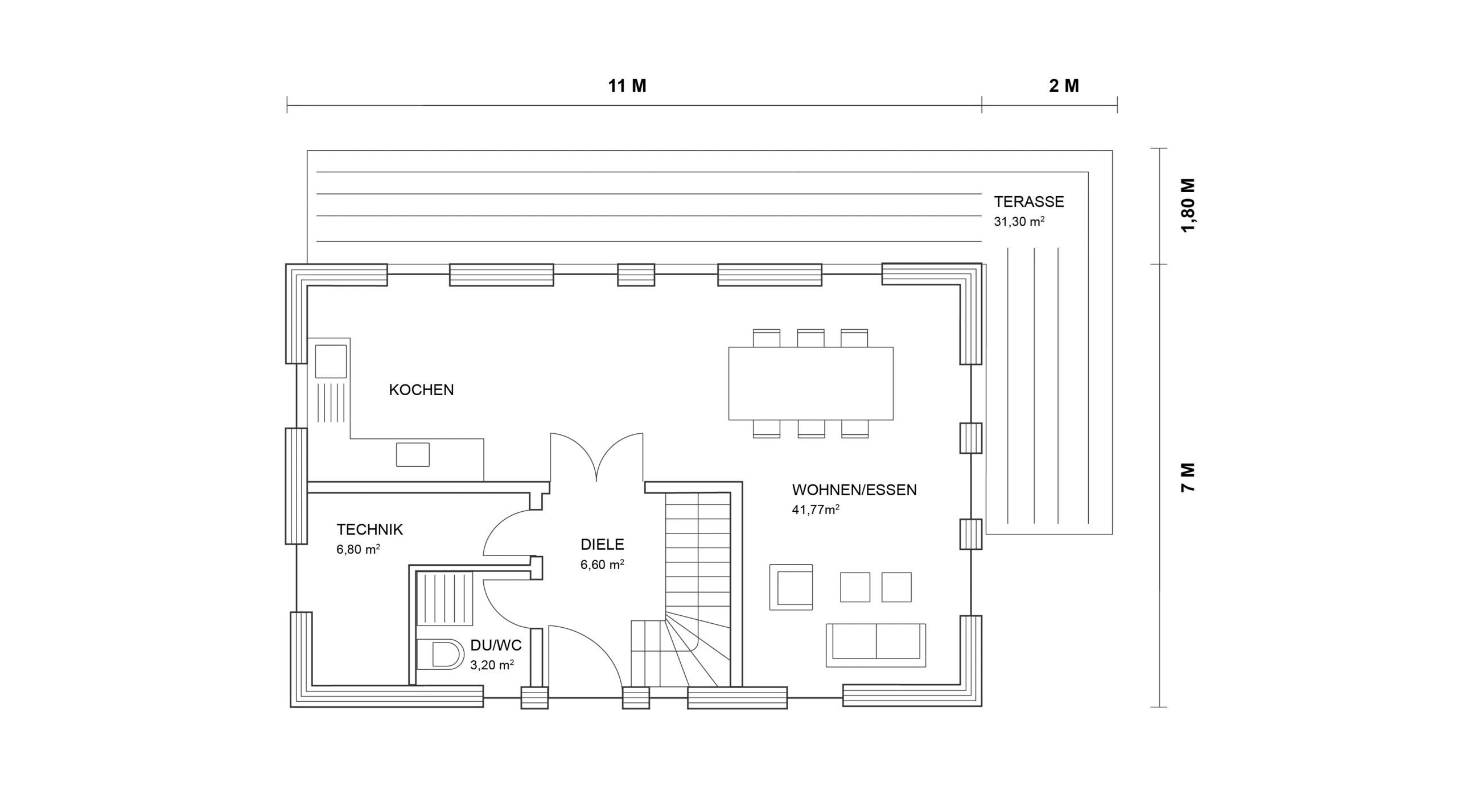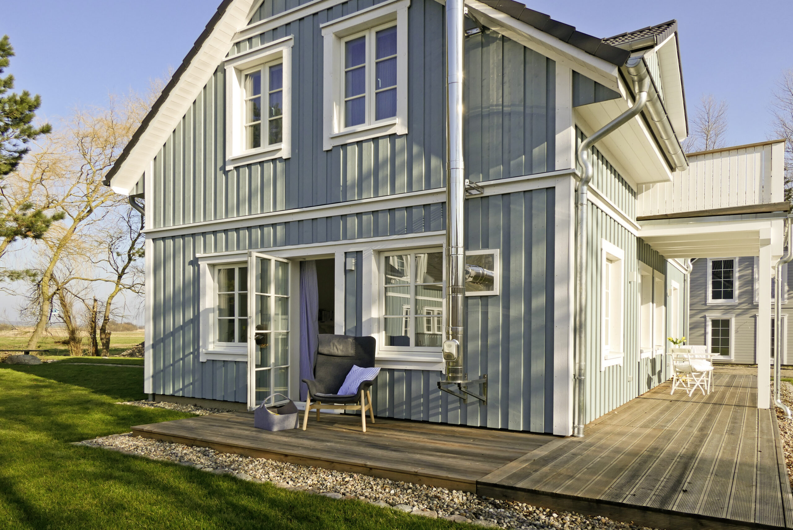 Die Haustür aus Aluminium steht für Langlebigkeit und klare Linien, während der Außenschornstein aus Edelstahl das äußere Erscheinungsbild elegant abrundet und gleichzeitig funktionalen Nutzen bietet.