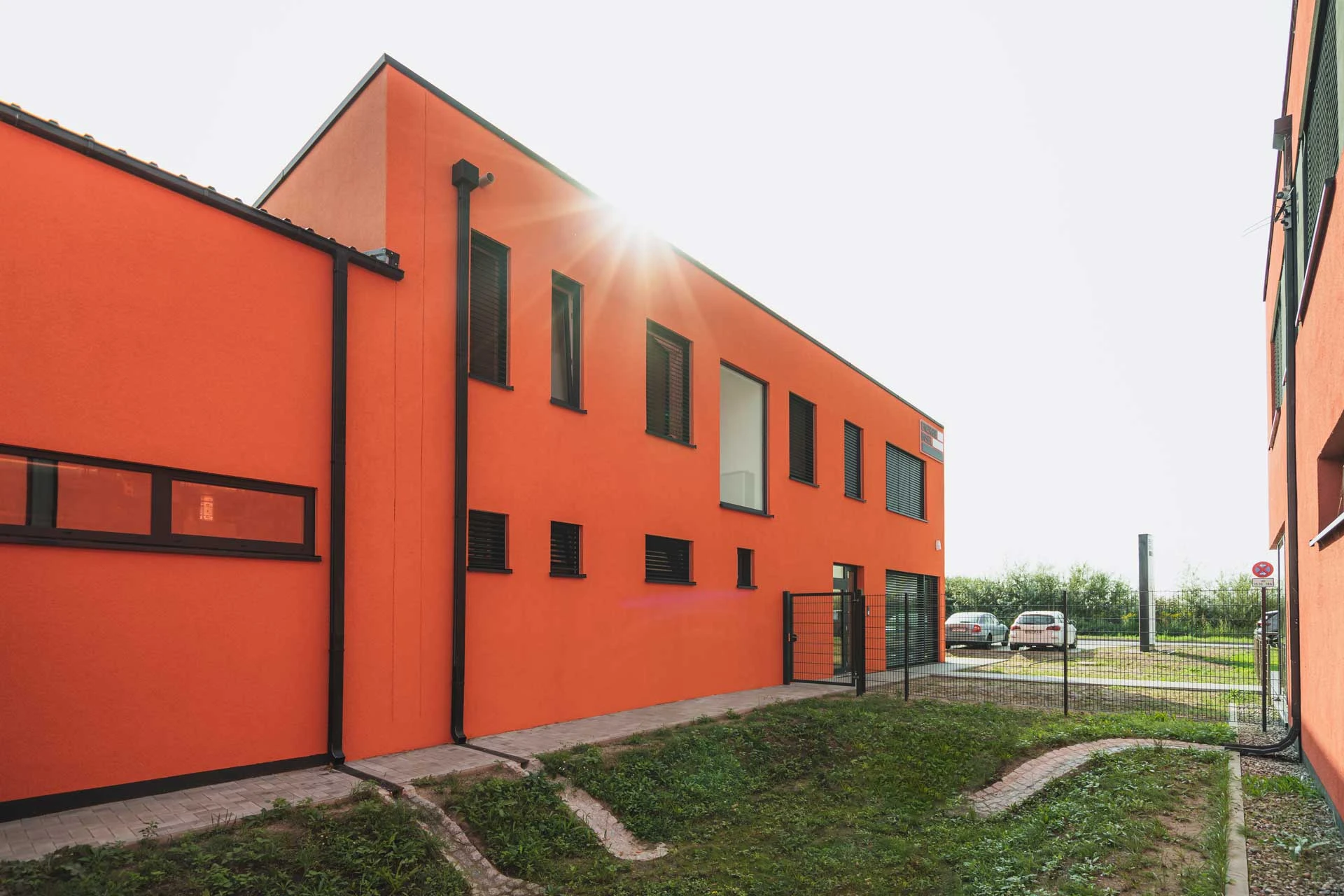 Die Kombination aus Bürogebäude und angrenzender Lagerhalle war gut gewählt. Direkt neben dem ersten Bürogebäude wurde ein Neubau errichtet, der optisch dem ersten sehr ähnelt. So entstand auf 975 m² eine perfekte Arbeitsumgebung mit viel Raum, um kreative und nachhaltige Lösungen für unsere Umwelt zu entwickeln. Die Geschossfläche wird unterteilt in ein Drittel Bürofläche und zwei Drittel Hallenfläche. Eine gute Herausforderung für uns, denn wir durften auch die Halle in Holzbauweise ausführen. Das Tragwerk der 40 m langen Halle wird dabei durch neun Leimholzbinder ausgebildet. Die Fassadenfarbe entspricht der Markenfarbe der Energieinsel GmbH und setzt somit ein optisches Highlight. Zwei nahezu einheitliche zweigeschossige Flachbauten besitzen zur Straße orientierte Fensterfronten im Erdgeschoss mit Empfangs- und Ausstellungsbereichen, in denen Kunden und Partner begrüßt werden. Die Büros in dem Gebäude sind entlang eines zentralen Erschließungsflurs angeordnet.